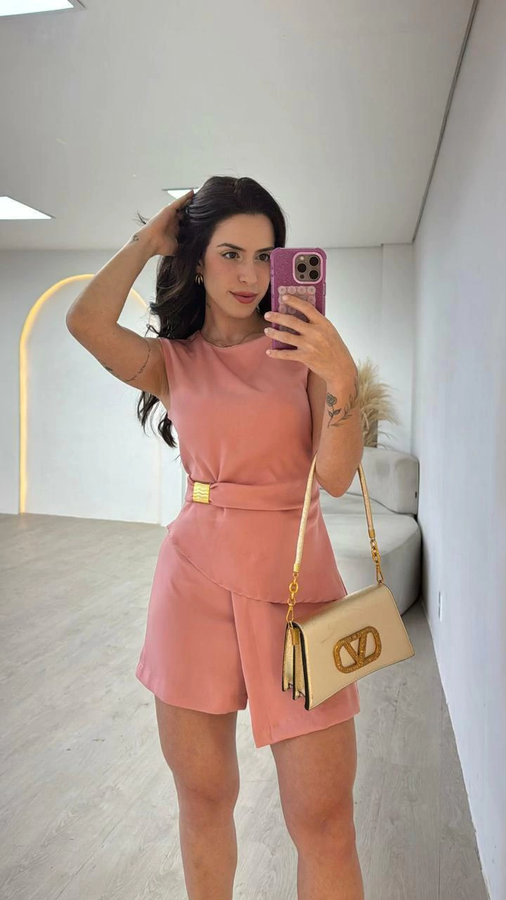 O Conjunto Antonela é a escolha perfeita para quem busca sofisticação e estilo minimalista. Composto por um blusê sem mangas e short saia assimétrico, o conjunto se destaca pelo design moderno e a cintura marcada com fivela dourada que traz um toque de elegância e glamour na medida certa.