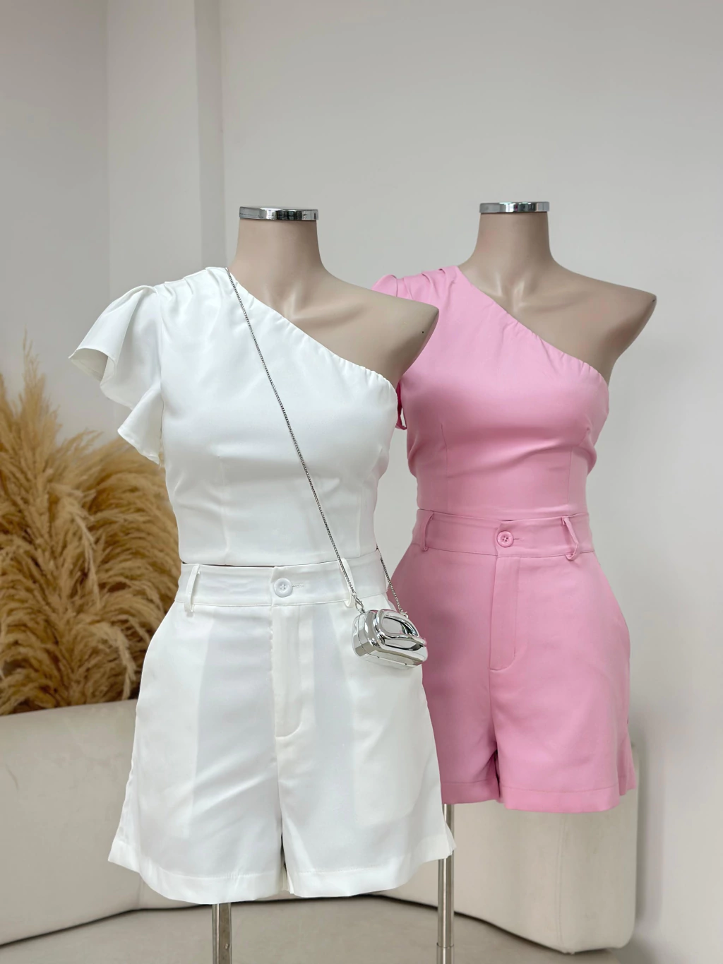 O Conjunto Gio é a combinação perfeita de modernidade e estilo! Composto por um top de um ombro só com detalhe de babado e um short de alfaiataria com bolsos, ele é a escolha certa para quem deseja um look jovem, elegante e cheio de personalidade.