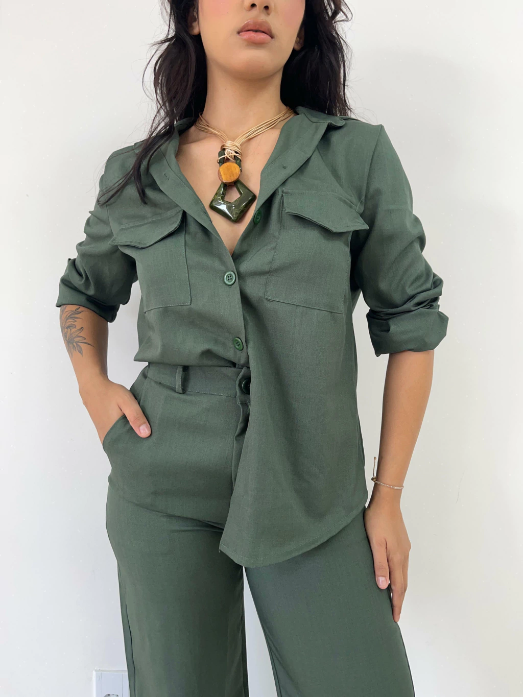 O Conjunto Ísis em linho sensorial é sinônimo de sofisticação minimalista. Composto por camisa de manga longa com bolsos frontais e calça pantalona de cintura alta, garante caimento leve, frescor e estilo. Ideal para quem busca praticidade sem abrir mão de um visual elegante e moderno. Perfeito para ambientes de trabalho, passeios ou produções casuais com um toque refinado.