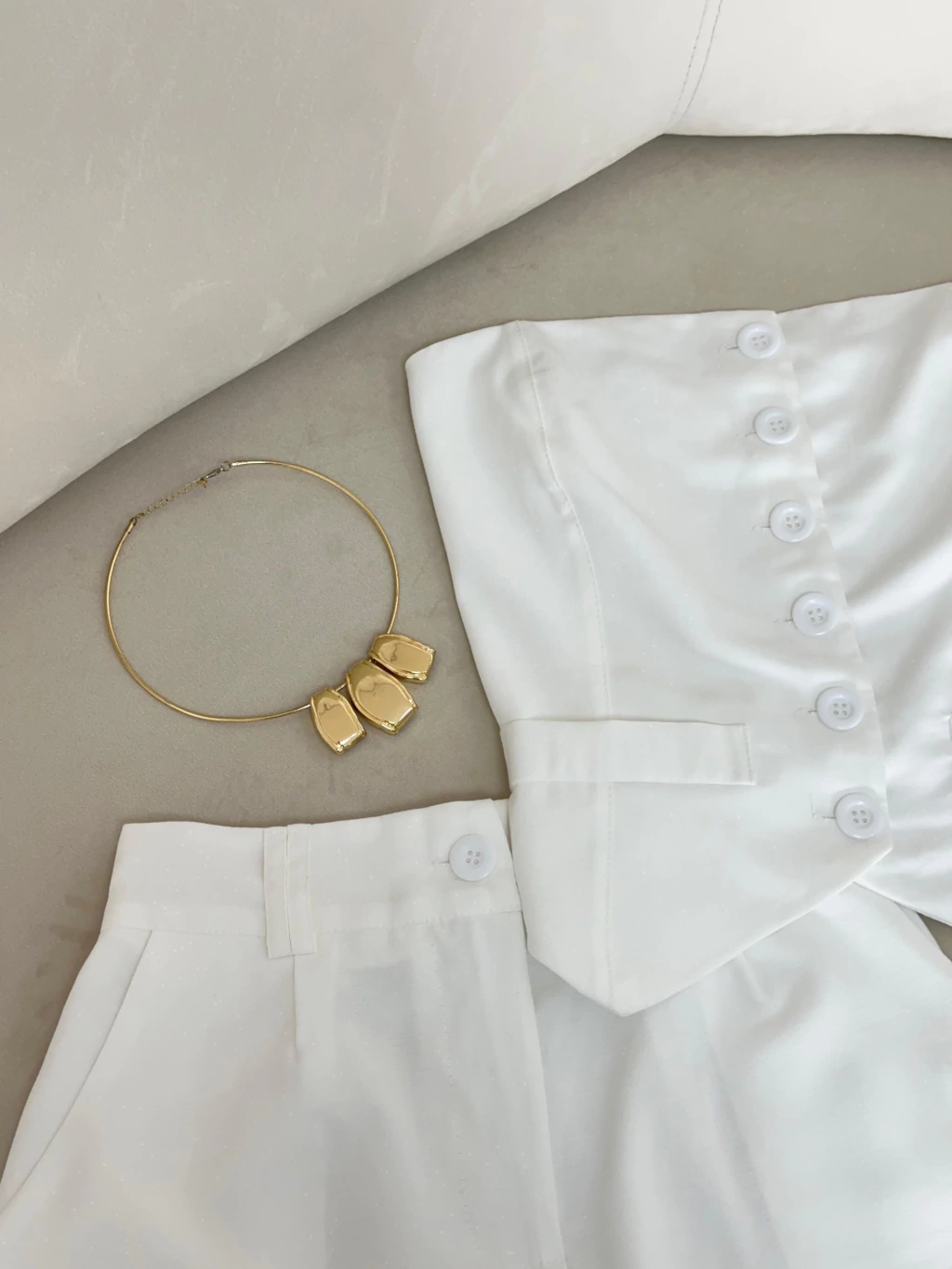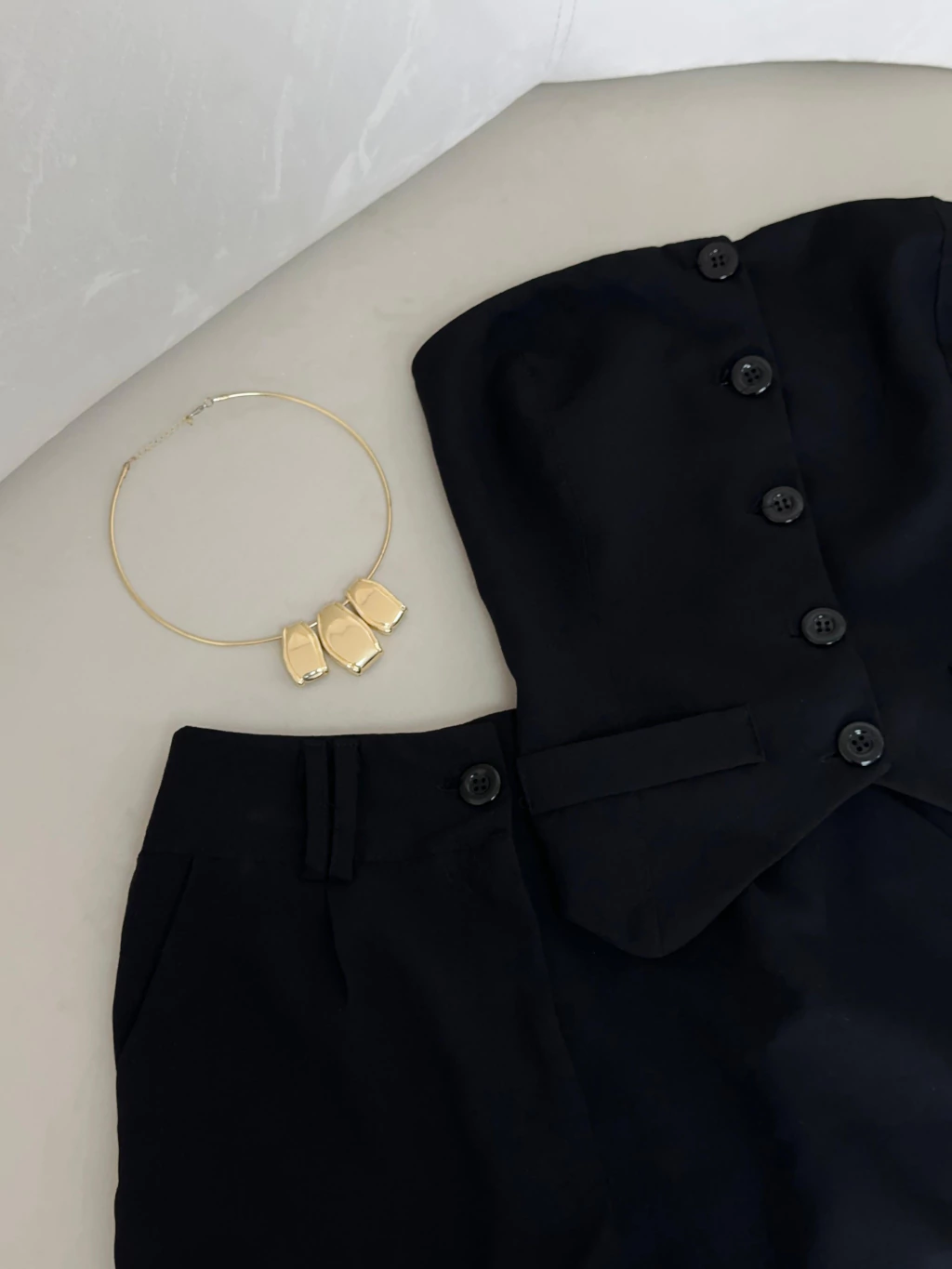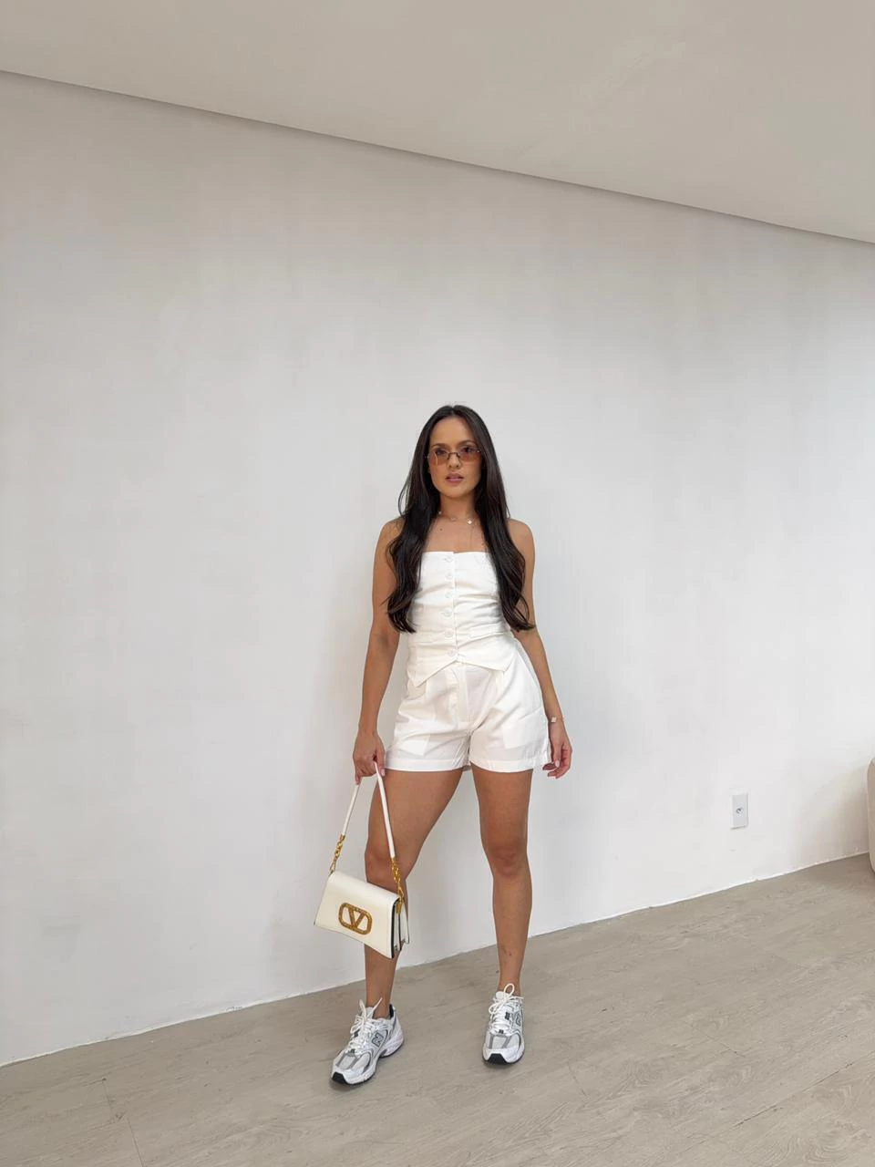 O Conjunto Sabrina é perfeito para quem busca estilo e sofisticação em uma única peça. Composto por blusa tomara que caia estruturada com botões frontais e shorts de alfaiataria, ele une elegância e conforto, criando um look moderno e versátil.