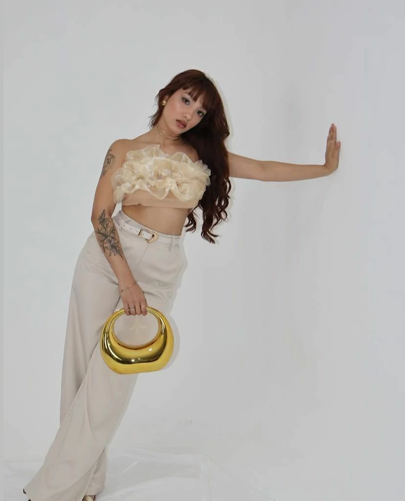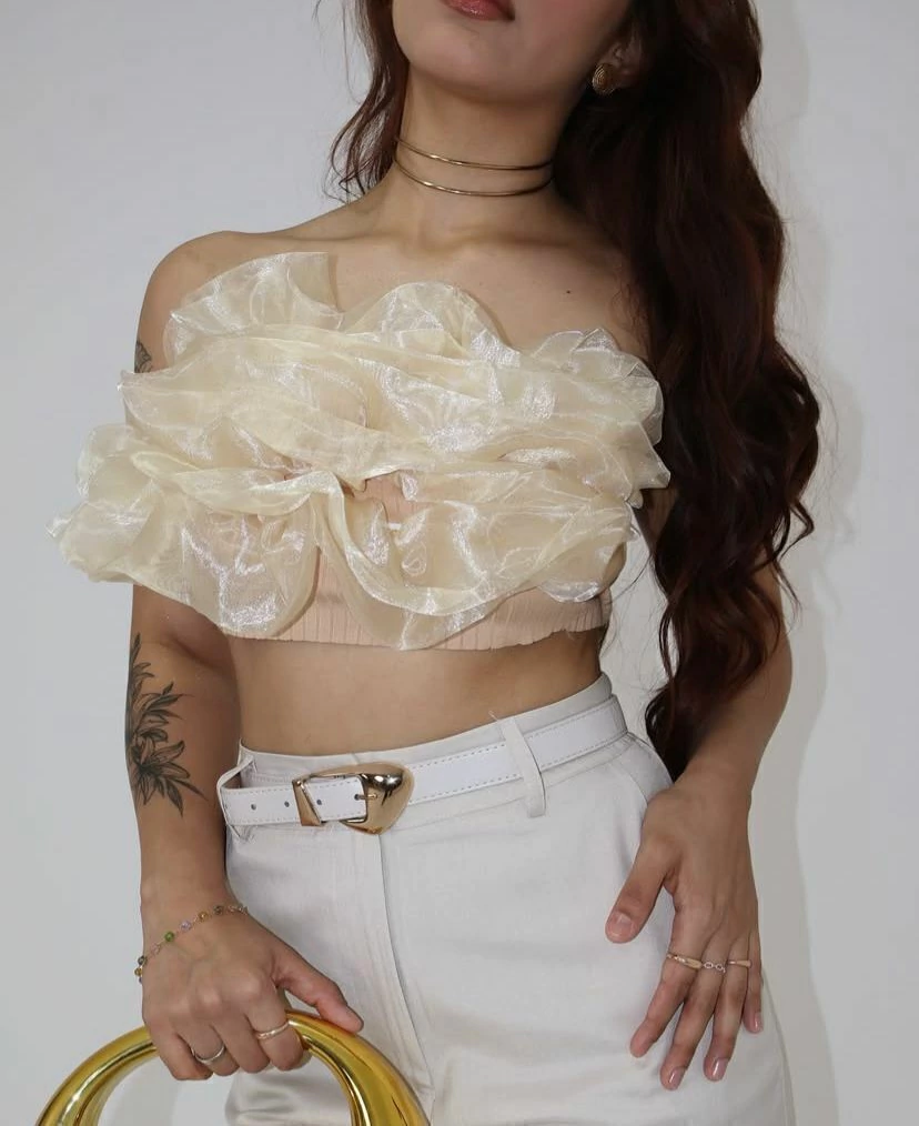 Um visual impactante e glamouroso! Esse cropped tomara que caia é confeccionado em tule organza bufante na parte frontal, criando um efeito volumoso e sofisticado que transforma qualquer produção em um verdadeiro look de fashionista.
