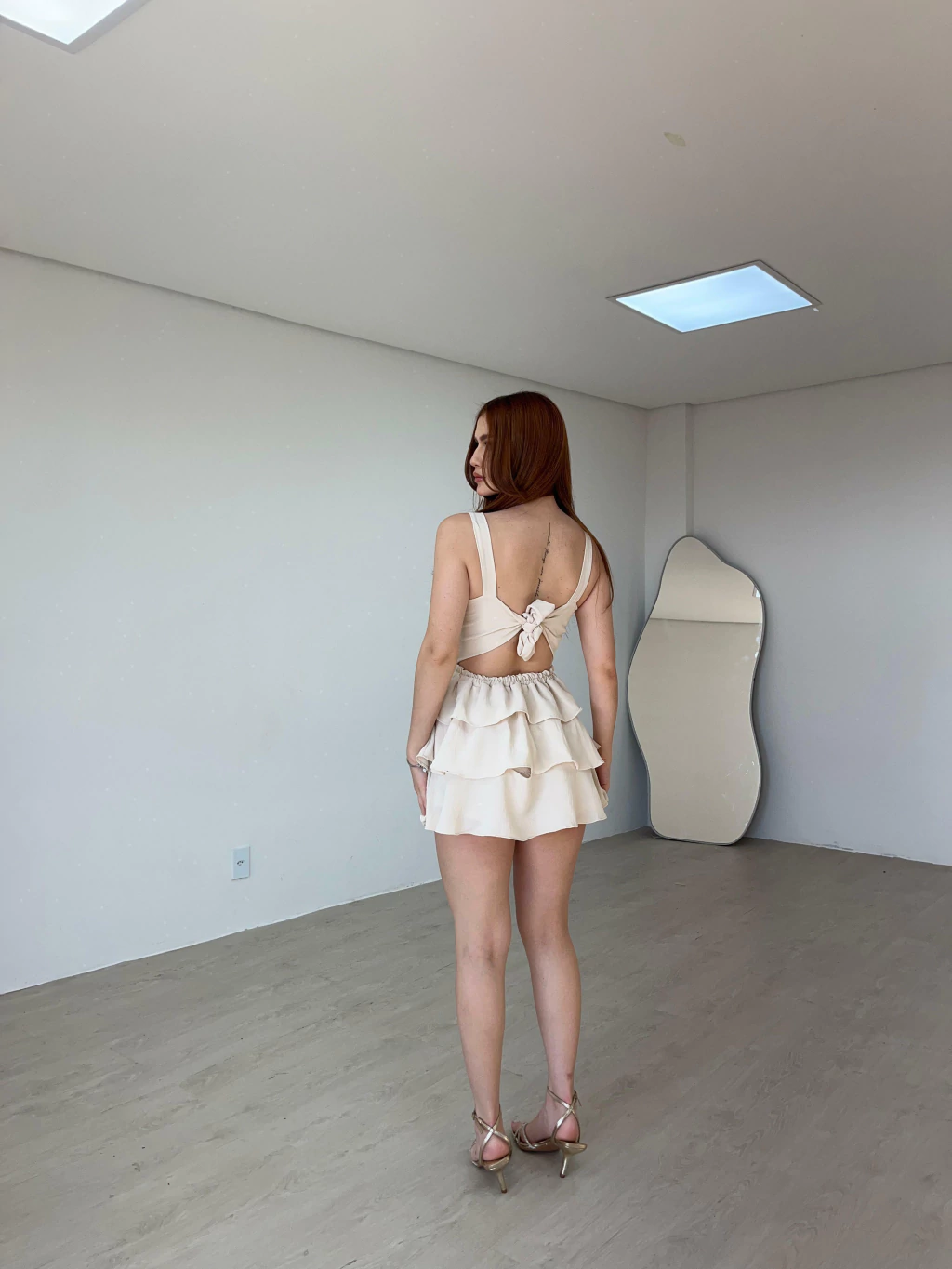 O Macaquinho Estrela é a escolha perfeita para quem busca um look ousado e feminino ao mesmo tempo. Com um design moderno, ele conta com decote em V profundo e recortes estratégicos no busto, conectados por um charm exclusivo em formato de estrela dourada. A peça possui alças largas para maior sustentação e conforto, além de uma saia com camadas babadas que trazem movimento e romantismo ao visual. É ideal para eventos, festas ou aquele jantar especial.