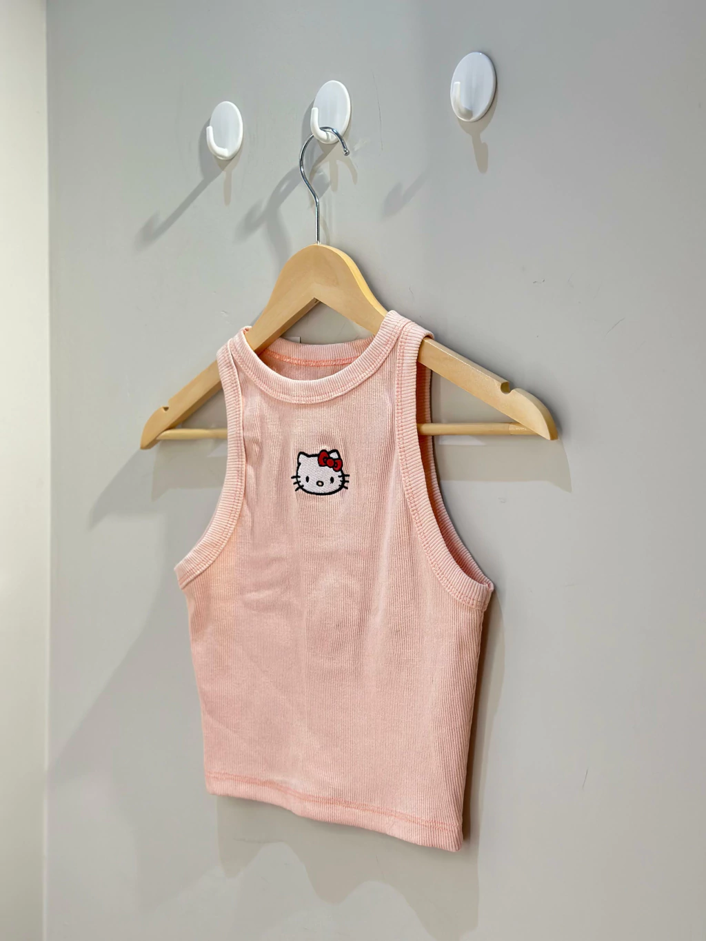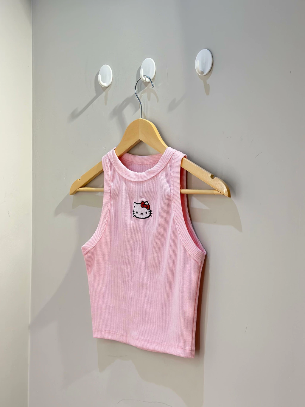 Regata Ribana Hello Kitty feminina no estilo cropped, com modelagem justa e gola alta. Confeccionada em tecido canelado de alta elasticidade, proporciona conforto e caimento perfeito. Detalhe bordado da Hello Kitty no peito, ideal para looks casuais, fofos e cheios de personalidade. Disponível em várias cores suaves e vibrantes. Perfeita para o verão, saídas informais ou composições estilosas.