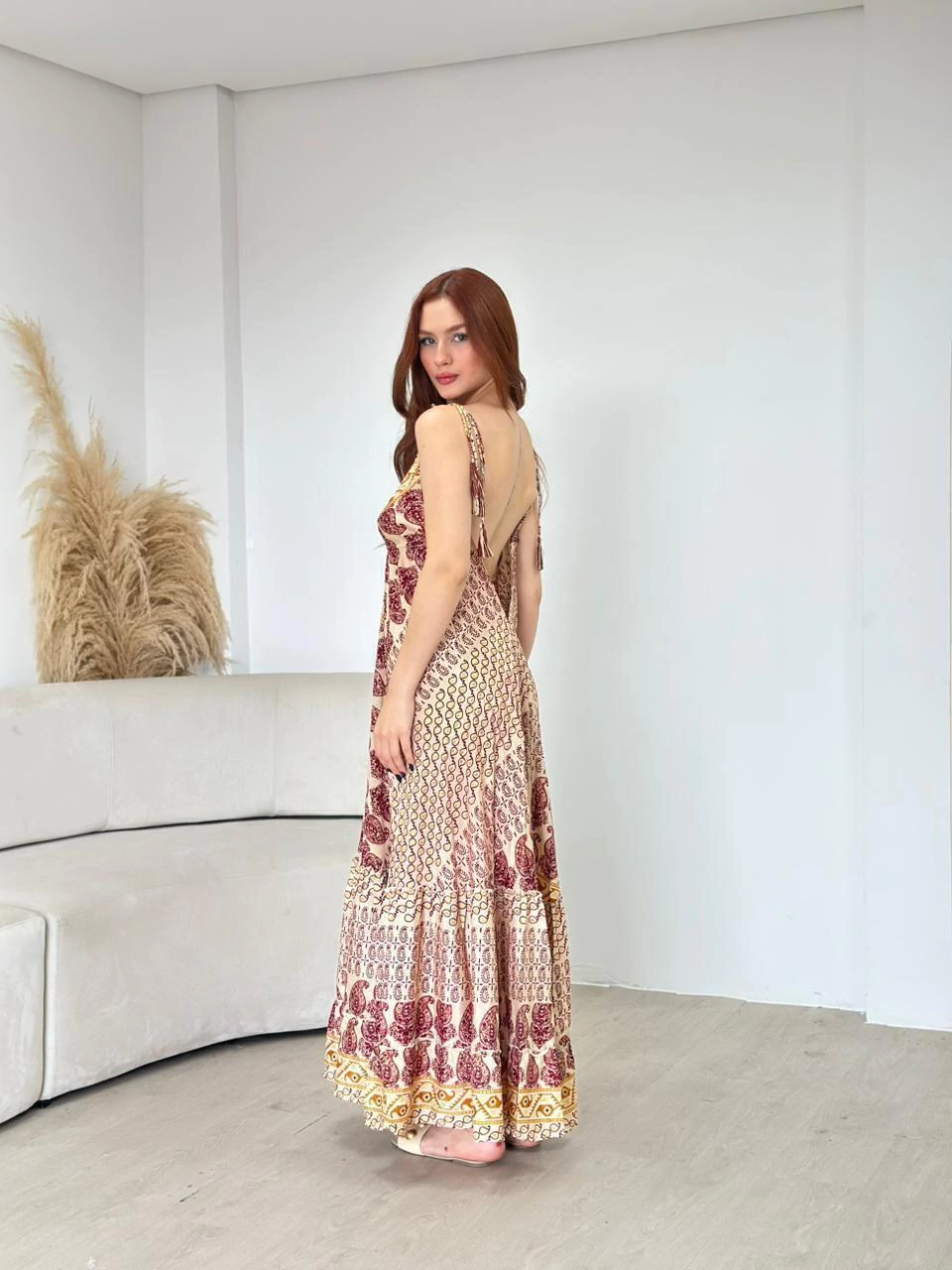 Descubra a leveza e o charme do nosso Vestido Indiano Longo! Com estampa exclusiva inspirada na beleza cultural do Oriente e modelagem que valoriza o corpo feminino, ele traz um toque boho e elegante ao seu visual. Seu decote com amarração no pescoço proporciona sustentação e um caimento perfeito, enquanto o tecido leve e fluido garante conforto durante todo o dia.